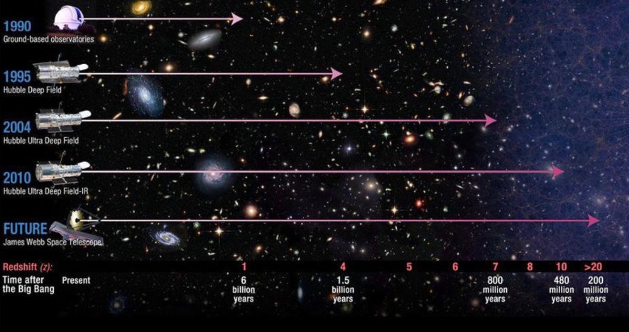 韋伯與歷代哈勃的比較,韋伯至少能夠觀測到宇宙誕生2億年時的景象。(NASA/JWST AND HST TEAMS)