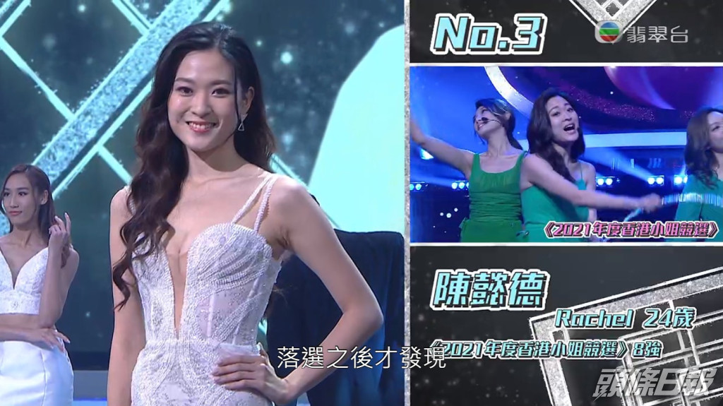 《香港小姐再竞选》于10月底播出时大玩神秘,当宣布冠亚季军时预告将于今晚(19日)台庆才公布赛果,大吊观众瘾!因主持《东张西望》而入屋的陈懿德(Rachel),赛前被封为大热,不少网民都力撑她夺冠。陈懿德其实是2021年度香港小姐竞选佳丽,当时打入最后八强止步,赛后加入TVB。陈懿德毕业于香港中文大学新闻及传理学系,有出色口才的她更获安排主持《东张西望》,被封为“东张女神”之一。